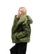 Kabát má velkou kapuci, vysoký límec okolo krku, zapínání na zip a na spodním dílu poutka s knoflíčky.